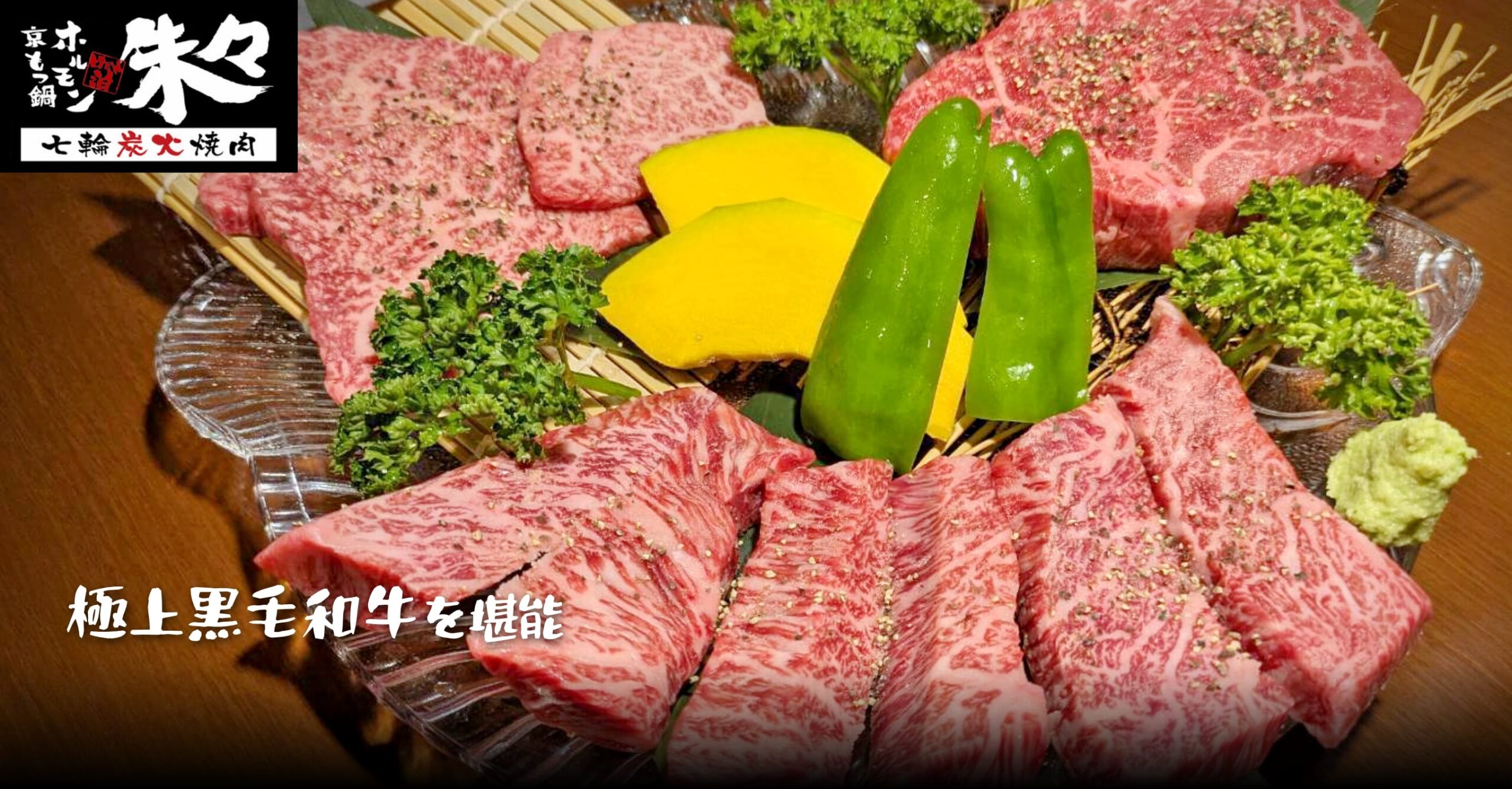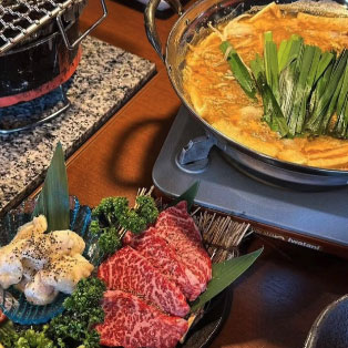 上タン、サガリ、カイノミステーキをはじめ、ホルモンや鶏モモなどの厳選部位を七輪炭火で堪能できるコースをご用意。満足度の高い内容で、朱々の味を存分に楽しめます。また、秘伝の白味噌が香る京もつ鍋コースもご用意しており、その日の気分に合わせてお選びいただけます。